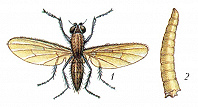 ЛУ́КОВАЯ МУ́ХА, луковая цветочница (Delia antiqua), насекомое из сем. мух-цветочниц. Вредитель лука (сильно повреждает репчатый лук, батун, в меньшей степени чеснок, порей, шалот) и тюльпанов. Широко распространена в Европе, Азии, Сев. Америке; в РФ наиболее вредоносна в Северном, Северо-Западном, Центральном регионах. Тело (длина 5–7 мм) пепельно-серого цвета, на спине с зеленоватым оттенком; крылья прозрачные. Личинка (длина до 10 мм) грязно-белая, гладкая, клиновидная, безногая, на заднем конце тела 16 зубовидных отростков. Зимует куколка в ложном коконе (пупарии), в почве на глубине 10–29 см. Весной вылет мух совпадает с цветением одуванчика и вишни. Самка откладывает до 60 яиц на всходы лука, листья, луковицы или на почву вблизи растения, располагая их одиночно или группами по 4–30 шт. Через 3–8 сут появляется личинка, которая внедряется в луковицу. В 1 луковице могут питаться более 30 личинок. У повреждённых растений листья желтеют и увядают, луковица загнивает. Личинки развиваются 15–25 сут и уходят в почву на окукливание. Стадия куколки 1-го поколения продолжается 2–3 нед. В году 1–3 поколения. О мерах защиты см. в ст. Луковая журчалка.