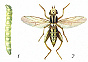 МЕРОМИ́ЗА, хлебная меромиза (Meromyza nigriventris, M. saltatrix), насекомое сем. злаковых мух. Вредитель пшеницы, ячменя, ржи, овса и др. хлебных зерновых культур. Распространена в странах Зап. Европы, Сев. Америки, в Ираке, Казахстане, Китае, Японии; в РФ – в Европ. части, Западно-Сибирском, Восточно-Сибирском и Дальневосточном регионах. Муха (длина 3–3,5 мм) с удлинённым телом грязно-жёлтого цвета, на среднеспинке 3 продольные чёрные или коричневатые полосы; бёдра задних ног утолщённые. Личинка (длина до 8 мм) зелёная, безногая. Яйцо белое, продолговатое. В году 2 поколения. Зимуют личинки внутри стеблей, весной там же окукливаются. Самки весеннего поколения откладывают яйца на верхнюю поверхность листьев озимых и яровых хлебов. Личинки внедряются в стебель. Повреждённые стебли обычно не дают колоса. Самки летнего поколения откладывают яйца на дикорастущие злаки и озимые хлеба. Меры защиты: лущение стерни, зяблевая вспашка, оптимально ранний сев яровых злаков.