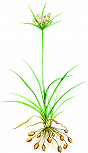 ЧУФА́, сыть съедобная, или земляной миндаль (Cyperus esculentus), травянистое растение из рода сыть семейства осоковых. Древняя пищевая и масличная культура. Родина Ч. – Средиземноморье и Северная Африка; растение выращивали в Египте с 6-го тыс. до н. э. (там Ч. использовали в пищу). Произрастает в умеренном и субтропическом поясах Северного полушария. Многолетняя трава (высота 30–90 см) с трёхгранными стеблями и жёсткими листьями шириной 3–10 мм. Цветки мелкие, жёлтые, обоеполые, собраны в зонтик; в зонах умеренного климата Ч. не цветёт. Растение ветроопыляемое. Плод – орешек буроватого цвета. Корневая система Ч. с многочисленными тонкими корневищами, на концах каждого из которых формируется мелкий продолговатый клубенёк, проникает в почву на глубину до 1 м. В течение вегетационного периода одно растение Ч. может сформировать от нескольких сотен до нескольких тысяч клубней. Клубеньки диаметром 3–19 мм, их цвет варьирует от жёлтого до коричневого и чёрного; мякоть белая, твёрдая, сочная, сладковатая на вкус. Клубеньки могут развиваться на глубине до 30 см, но большинство из них формируется в верхней части пахотного горизонта и могут переносить неблагоприятные почвенные условия, включая периоды засухи и затопления, а также понижение температуры почвы до –5 °C. В клубеньках (на сухую массу) содержится 20–25% масла, 25–30% крахмала, 15–20% сахарóв, 3–7% белковых веществ; их употребляют в пищу сырыми, жареными, сушёными, запечёнными; муку из жареных клубеньков добавляют в хлебобулочные изделия. Из клубеньков получают также невысыхающее пищевое масло, содержащее жирные кислоты, из них: 18% насыщенных (пальмитиновая и стеариновая кислоты) и 82% ненасыщенных (олеиновая и линолевая кислоты). По качеству масло Ч. приближается к оливковому и миндальному, его используют в кондитерской и консервной отраслях промышленности, в медицине и косметологии. Было предложено использовать масло Ч. для производства биодизельного топлива. Зелёную массу Ч. можно скармливать скоту и силосовать. На корм животным используют также жмых. Ч. – тепло- и влаголюбивая культура, лучше растёт на лёгких, рыхлых почвах (рН от 5,0 до 7,5), не переносит засоления почв. Выращивают Ч. в однолетней культуре в Африке, Америке, Азии и Европе (основные промышленные посадки Ч. сосредоточены в Испании, главным образом в Валенсии, а также в Египте). Размножают растение клубеньками, способ посева широкорядный с междурядьями 60 см; высаживают в апреле – мае. Уход за посадками включает полив, междурядную обработку, борьбу с сорняками, подкормку удобрениями и окучивание. Убирают урожай в ноябре – декабре; урожайность клубеньков 10–19 т/га. Выкопанные комбайнами клубеньки промывают водой для удаления почвенных частиц. Сушка происходит, как правило, на солнце и может занять до трёх месяцев. Сушёные клубни имеет нежный, сладкий, ореховый вкус. Во многих странах Ч. считается сорным растением. Для ликвидации старых посевов Ч. применяют гербициды. Растение используют также в качестве декоративной культуры. Засоряющая посевы Ч. сыть круглая (Cyperus rotundus) – близкий вид, отличающийся фиолетовой окраской соцветий, также формирует клубеньки (множественные на каждом корневище), но они непригодны в пищу из-за горького вкуса.