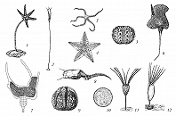 ИГЛОКО́ЖИЕ (Echinodermata), тип морских беспозвоночных животных. Появились в раннем кембрии, к концу палеозоя достигли большого разнообразия. Размеры от нескольких миллиметров до 1 м (редко более – у совр. видов) и до 20 м у некоторых ископаемых морских лилий. Форма тела разнообразна: звездчатая, дисковидная, шаровидная, сердцевидная, чашеобразная, червеобразная или напоминающая цветок. Известно ок. 10 000 ископаемых видов и ок. 6300 современных. Из 20 известных классов до настоящего времени сохранились 5, относящихся к подтипам: кринозои (сидячие формы, ориентированные ртом вверх, с единственным классом морские лилии), эхинозои (объединяет морских ежей и голотурий) и астерозои (включает морских звёзд и офиур). По др. классификации представителей последних 2 подтипов объединяют в подтип элеутерозой.