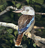 КУКАБА́РА, кукабарра (Dacelo), род птиц сем. зимородковых. 4 вида. Длина от 27,5 см (краснобрюхая К., D. gaudichaud) до 46 см (смеющаяся К., или зимородок-великан, D. novaeguineae), масса до 470 г. Голова крупная; клюв массивный, надклювье с небольшим крючком, темнее подклювья. Крылья широкие, хвост относительно длинный. Окрашены пёстро; в оперении присутствуют белые, бурые, чёрные, тёмно-синие и яркие лазурные или рыжевато-красные тона. У самцов краснобрюхой К. и синекрылой К. (D. leachii) хвост тёмно-синий, у самок он рыжий с тёмными полосами и белой вершинной каймой. Смеющаяся К. населяет Вост. Австралию, завезена в её зап. часть, на Северный о. Новой Зеландии, острова Тасмания, Кенгуру и Флиндерс. Синекрылая К. обитает на севере Австралии и в Новой Гвинее, где встречаются также краснобрюхая К. и аруанская К. (D. tyro), гнездящиеся также на некоторых прилежащих островах. К. предпочитают сухие редколесья и тропич. леса; смеющаяся К. охотно селится в гор. садах и парках. К. ведут оседлый образ жизни, встречаются парами и семейными группами (до 14 птиц). Питаются насекомыми, ракообразными и рыбой; в рационе крупных видов, живущих вдали от водоёмов, обычны пресмыкающиеся (особенно змеи), птицы (разоряют гнёзда) и мелкие зверьки. Голос К. громкий и резкий; у смеющейся К. и синекрылой К. он похож на хохот; характерны групповые «хоры», особенно на рассвете и закате. Гнездятся в дуплах или древесных термитниках на выс. до 60 м, иногда в норах. В кладке обычно 2–4 яйца; насиживают ок. 3–4 нед; выводок кормят до 40 дней. В году 2 кладки. У смеющейся К. молодые самки остаются с родителями 1–2 года, самцы – до 4 лет; они помогают взрослым птицам защищать территорию, насиживать кладку и кормить выводок.