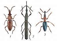 ДЛИННОТЕ́ЛЫ (Brenthidae), семейство жуков подотряда разноядных, близкое к долгоносикам. Тело (длина от 4 до 30 мм и более) сильно удлинённое. Голова вытянута в головотрубку, усики нитевидные или чётковидные. Личинки цилиндрические, с короткими ногами, беловатые. Ок. 1300 видов, преим. в тропических лесах. В России 2 вида, на Дальнем Востоке. Развиваются под корой и в древесине упавших деревьев. Взрослые Д. питаются гифами грибов или хищники. Некоторые Д. связаны с муравейниками; напр., распространённый в Ср. Азии пустынный длиннотел (Eremoxenus chan) живёт в симбиозе с крупными муравьями-древоточцами. Иногда Д. повреждают тропич. культуры (чай, кофе) и заготовленные брёвна.