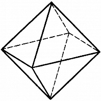 ОКТА́ЭДР (греч. ὀϰτάεδρον, от ὀϰτώ – восемь и ἕδρα – грань), один из пяти правильных многогранников. О. имеет (рис.) 8 треугольных граней, 12 рёбер, 6 вершин (в каждой вершине сходятся 4 ребра). Объём О. равен $a^3\sqrt{2}/3 \approx0,4714a^3$, где $a$ – длина ребра О. Назв. «О.» дано др.-греч. математиком Теэтетом (4 в. до н. э.).