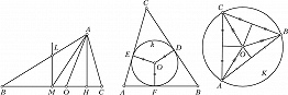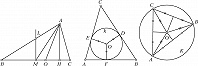 Отрезок, соединяющий середины двух сторон Т., называется его средней линией. Окружность, касающаяся всех трёх сторон Т., называется вписанной окружностью. На рис. 2 показана окружность $k$, вписанная в Т. $ABC$, её радиус равен $OD=OE=OF$. Окружность, проходящая через все вершины Т., называется описанной окружностью. На рис. 3 показана окружность $K$, которая описана около Т. $ABC$, её радиус равен $OA=OB=OC$.